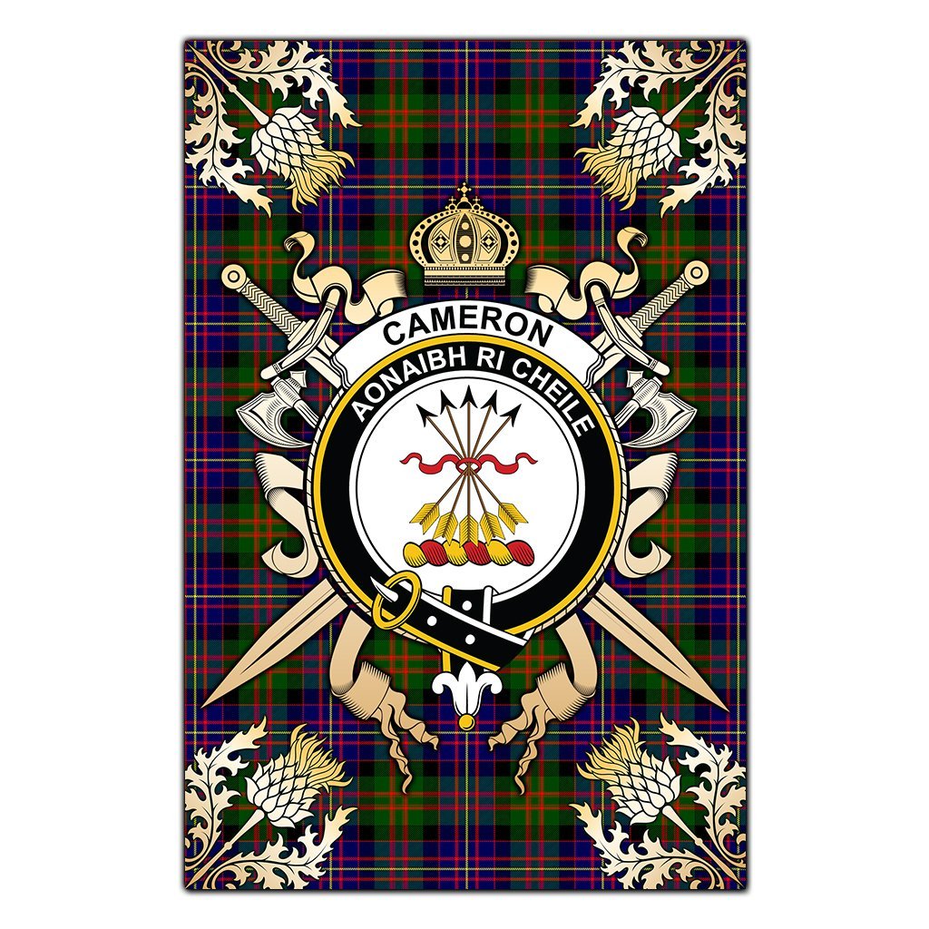 Cameron Of Erracht Modern Tartan Crest Black Garden Flag - Gold Thistle Style