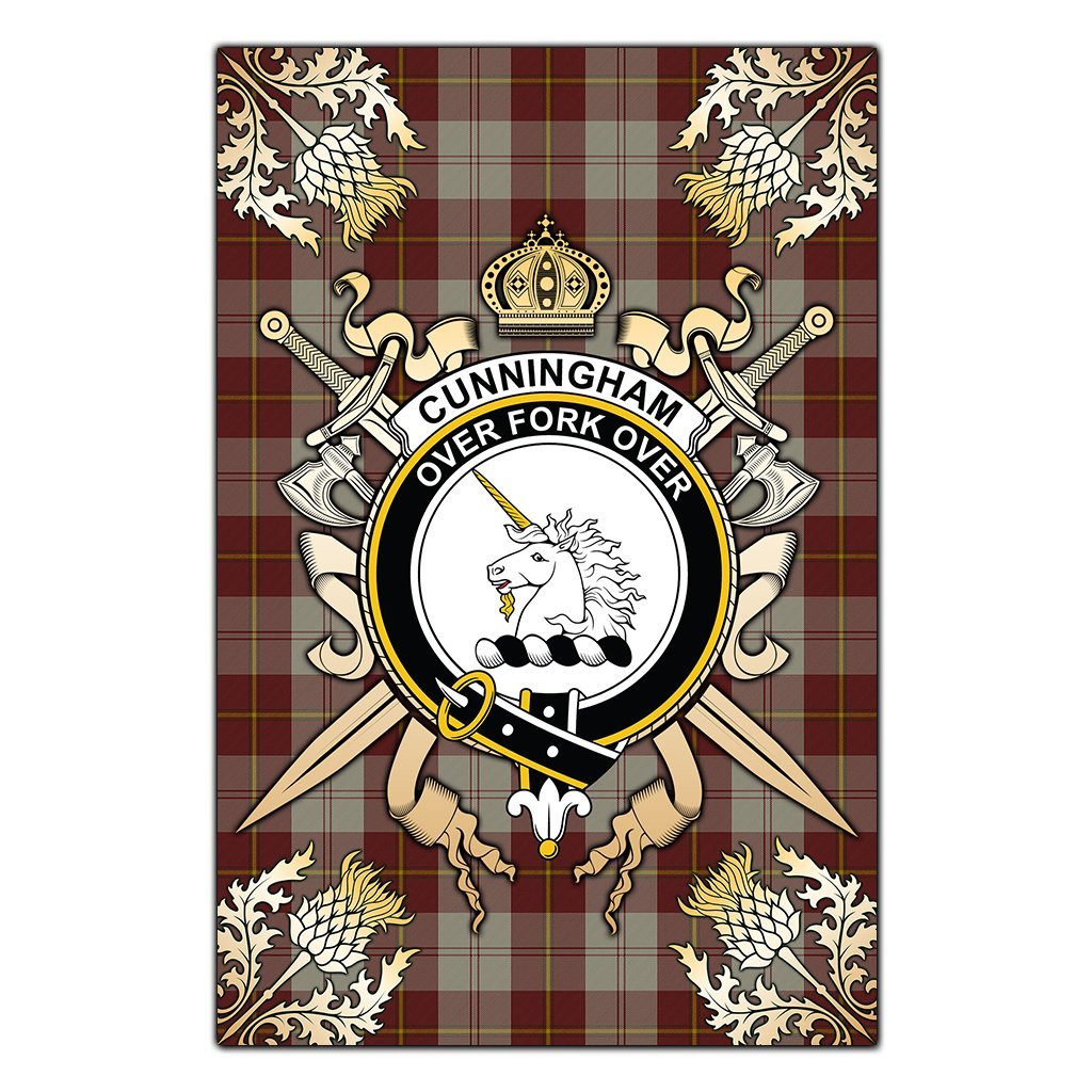 Cunningham Burgundy Dancers Tartan Crest Black Garden Flag - Gold Thistle Style