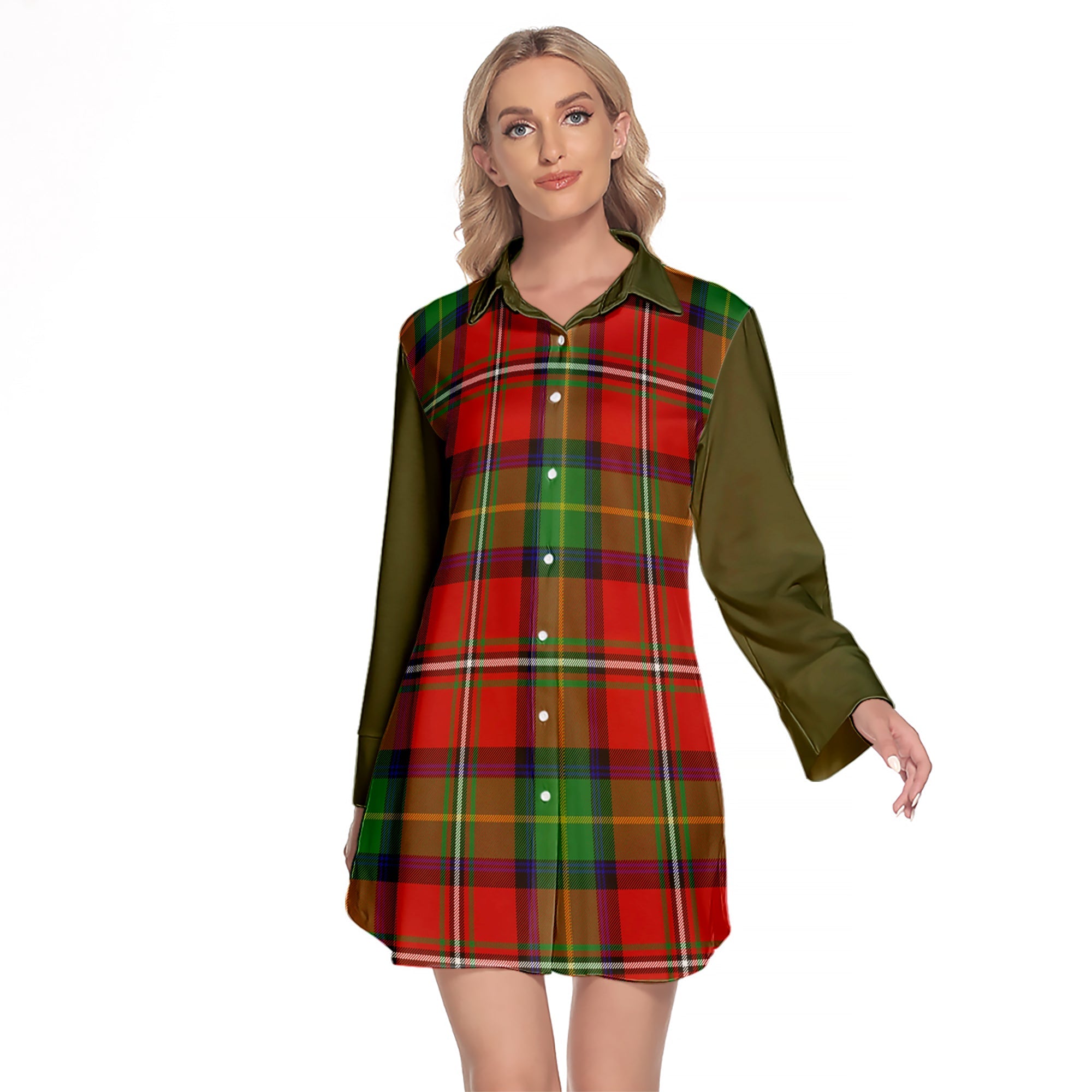 Fullerton Tartan Women's Lapel Shirt Dress With Long Sleeve