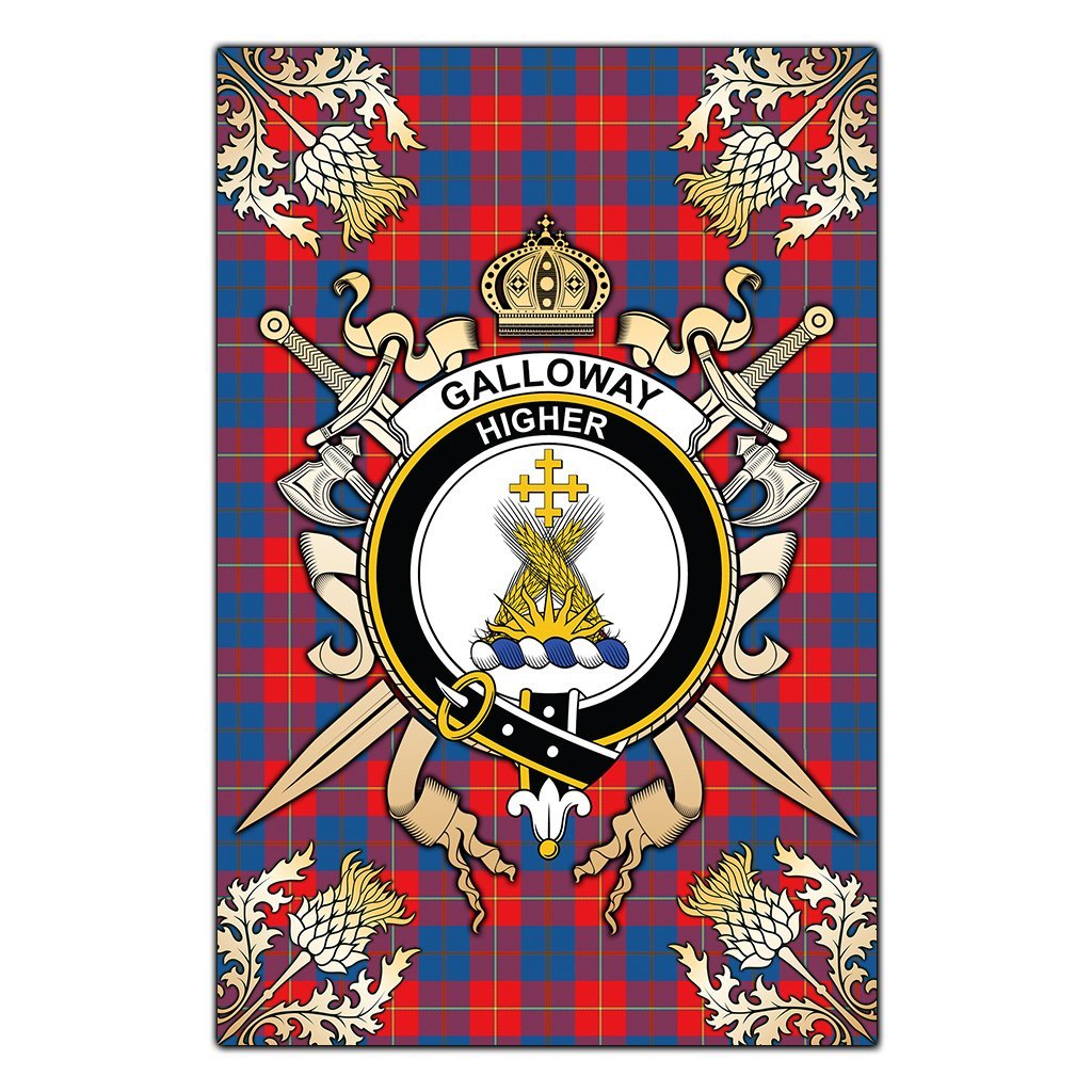 Galloway Red Tartan Crest Black Garden Flag - Gold Thistle Style