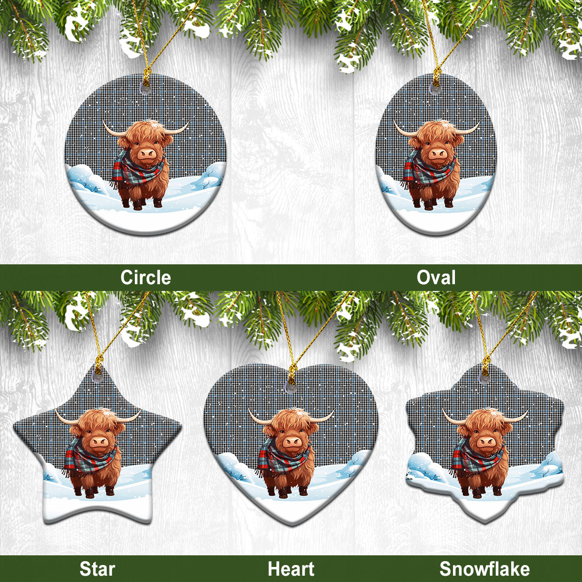 Gladstone Tartan Christmas Ceramic Ornament - Highland Cows Snow Style