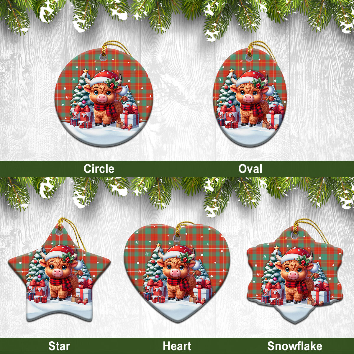 MacFie Ancient Tartan Christmas Ceramic Ornament - Highland Cow Winter Style