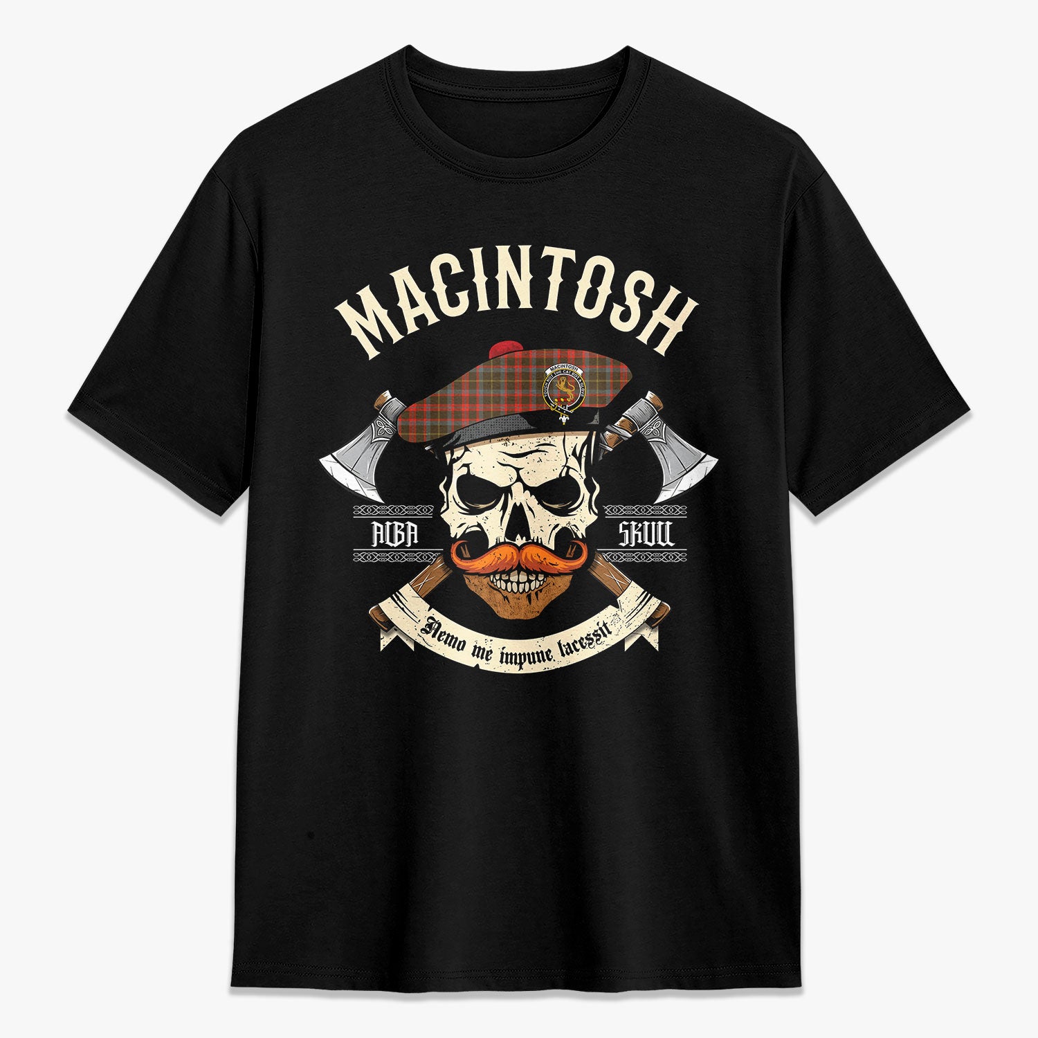 MacIntosh Hunting Weathered Tartan Crest 2D T-shirt - Alba Skull Style,
