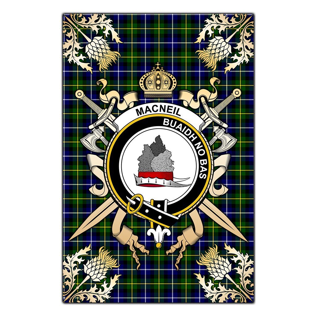 MacNeil of Barra Modern Tartan Crest Black Garden Flag - Gold Thistle Style