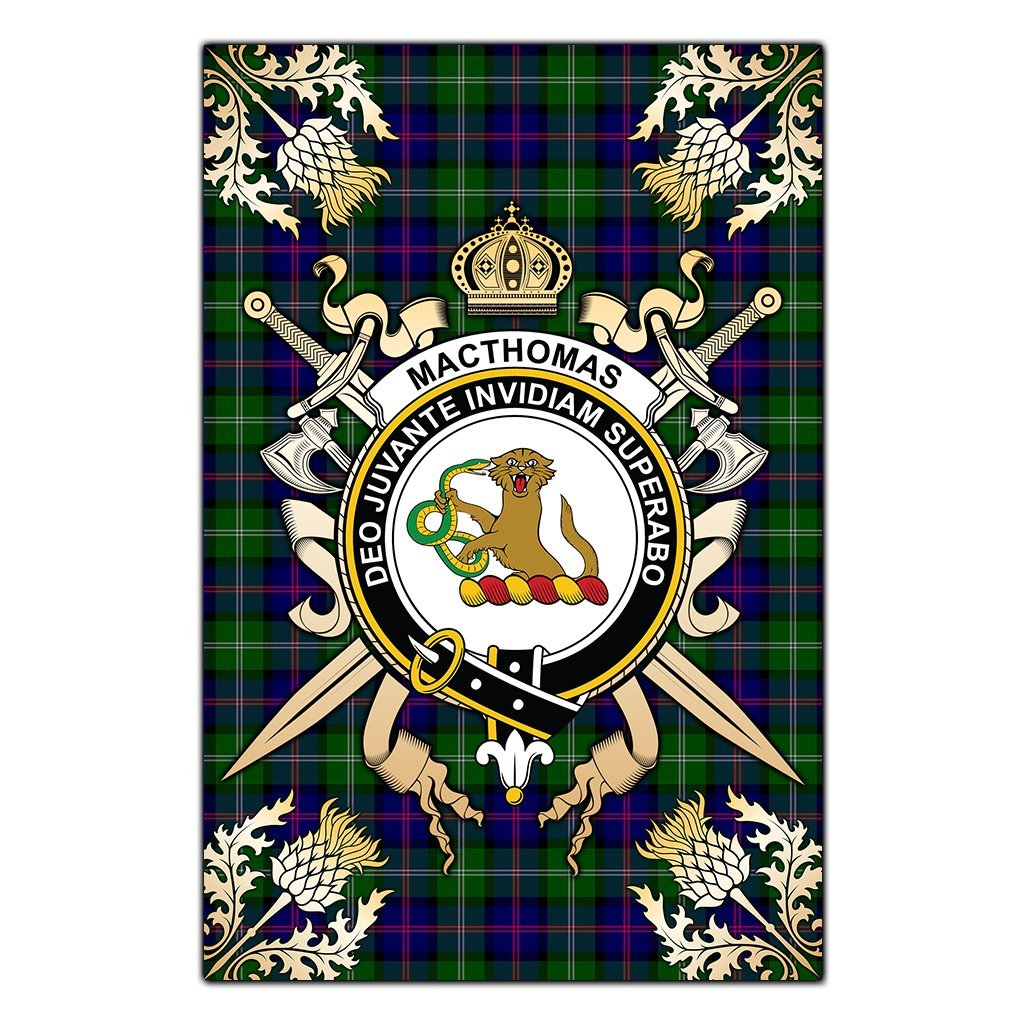 MacThomas Modern Tartan Crest Black Garden Flag - Gold Thistle Style
