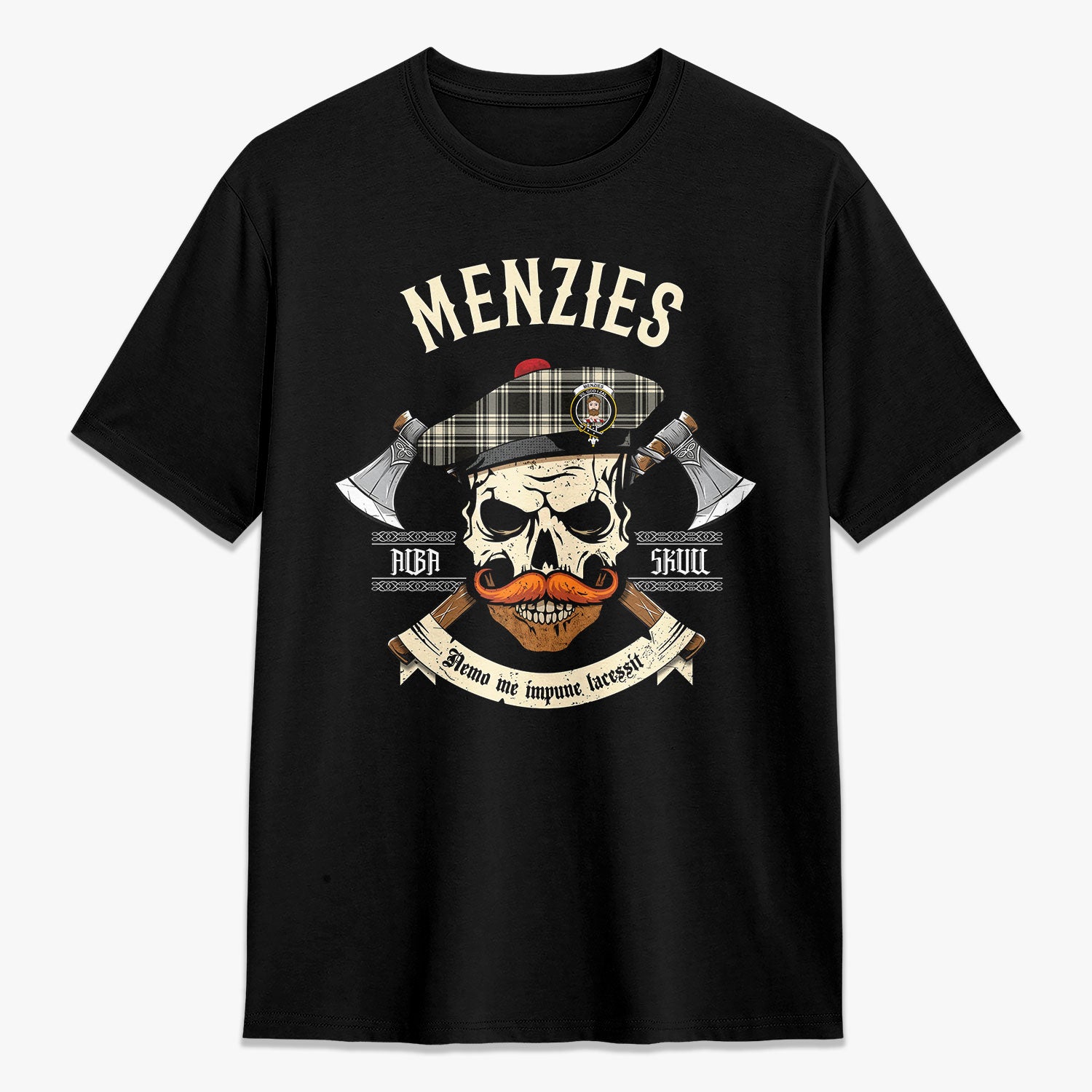 Menzies Black - White Ancient Tartan Crest 2D T-shirt - Alba Skull Style,