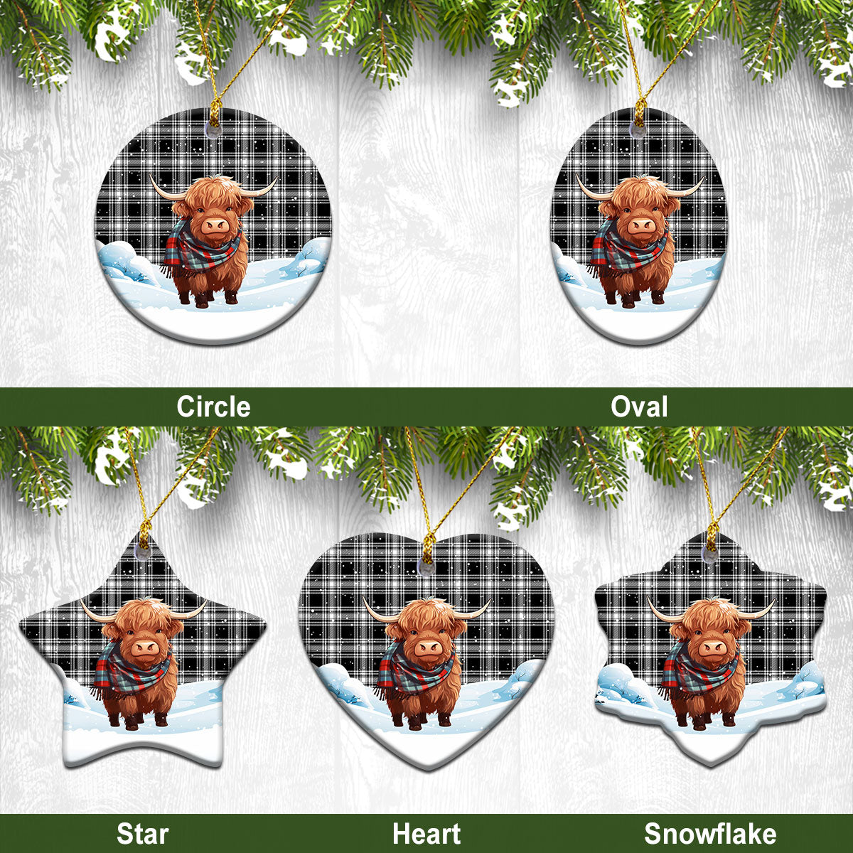 Menzies Black - White Modern Tartan Christmas Ceramic Ornament - Highland Cows Snow Style