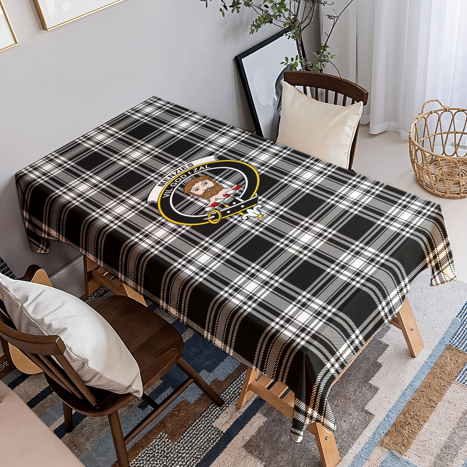Menzies Black - White Modern Tartan Crest Tablecloth