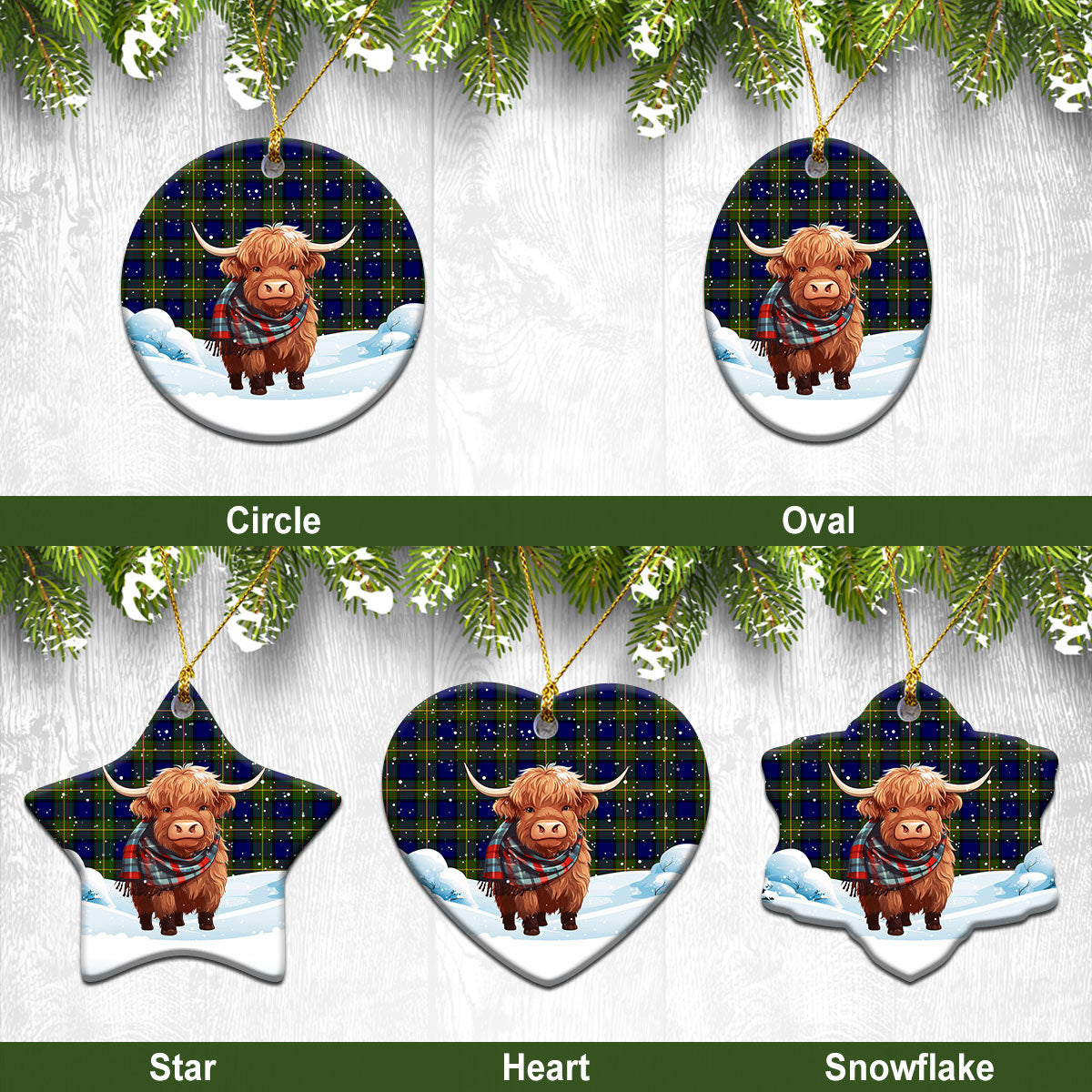 Muir Tartan Christmas Ceramic Ornament - Highland Cows Snow Style