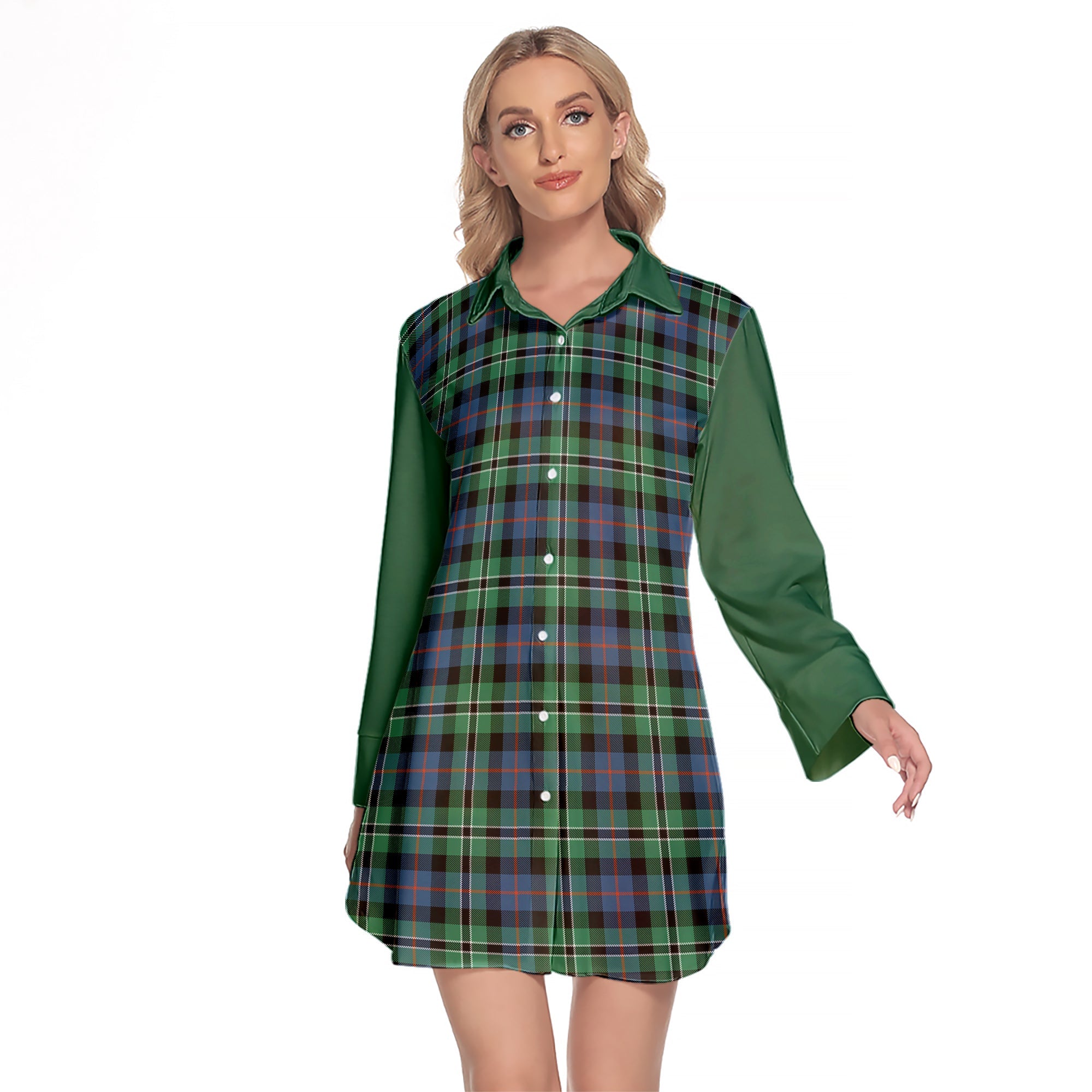 Rose Hunting Ancient Tartan Women's Lapel Shirt Dress With Long Sleeve