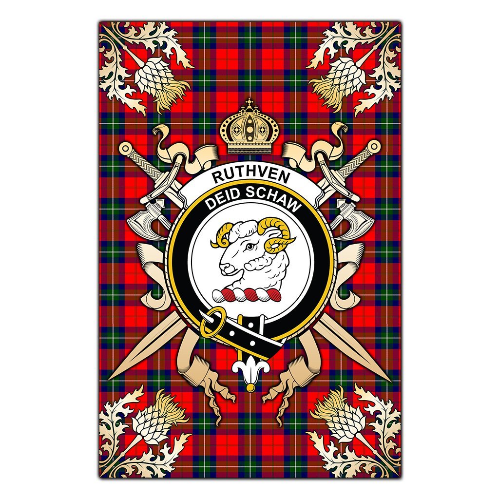 Ruthven Modern Tartan Crest Black Garden Flag - Gold Thistle Style