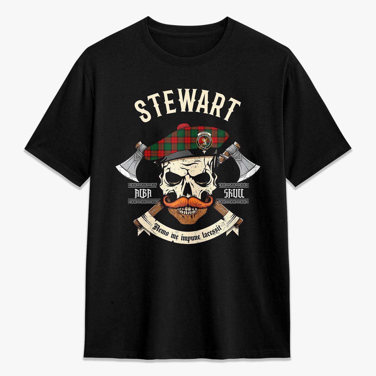 Stewart Atholl Modern Tartan Crest 2D T-shirt - Alba Skull Style,