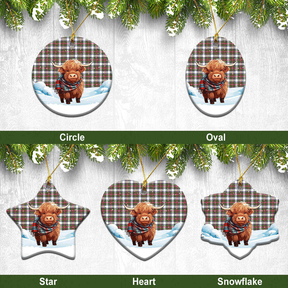 Stewart Dress Modern Tartan Christmas Ceramic Ornament - Highland Cows Snow Style