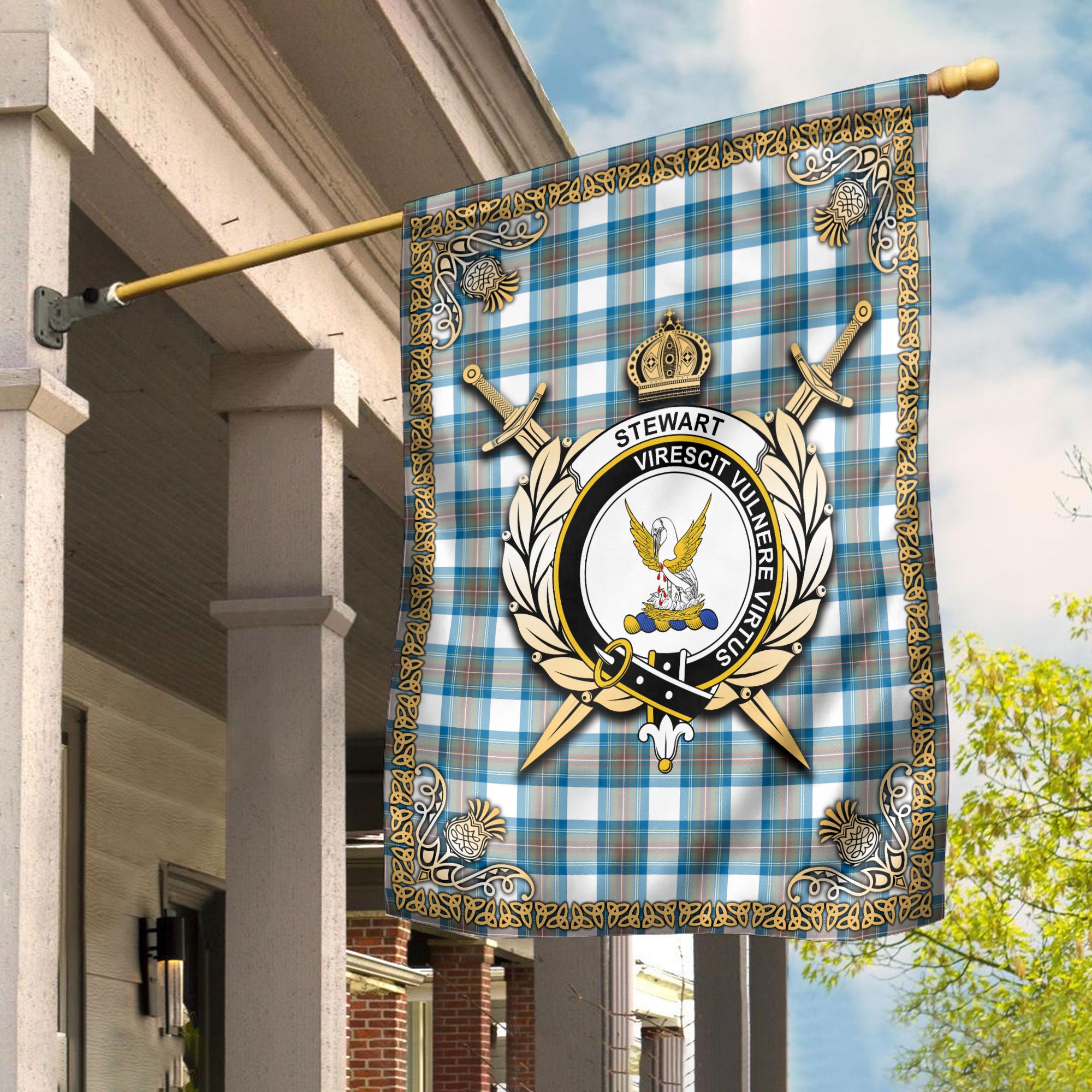Stewart Muted Blue Tartan Crest Garden Flag - Celtic Thistle Style