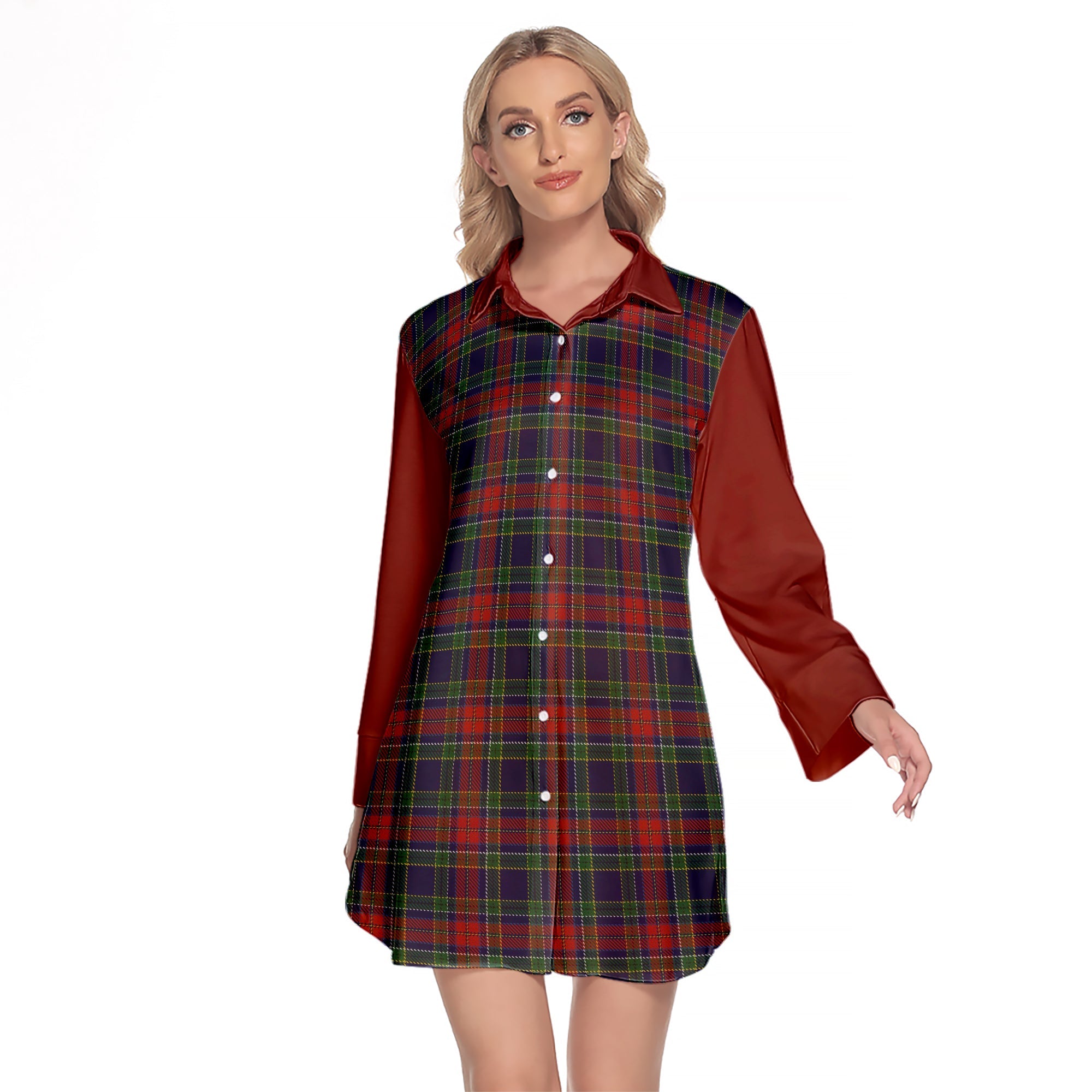 Allison Red Tartan Women's Lapel Shirt Dress With Long Sleeve