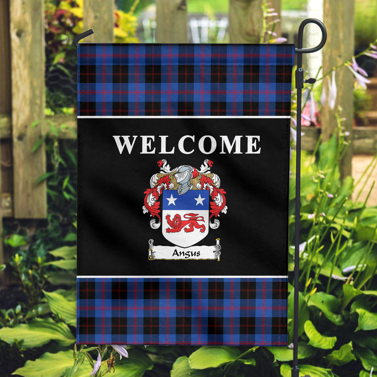 Angus Modern Tartan Crest Black Garden Flag