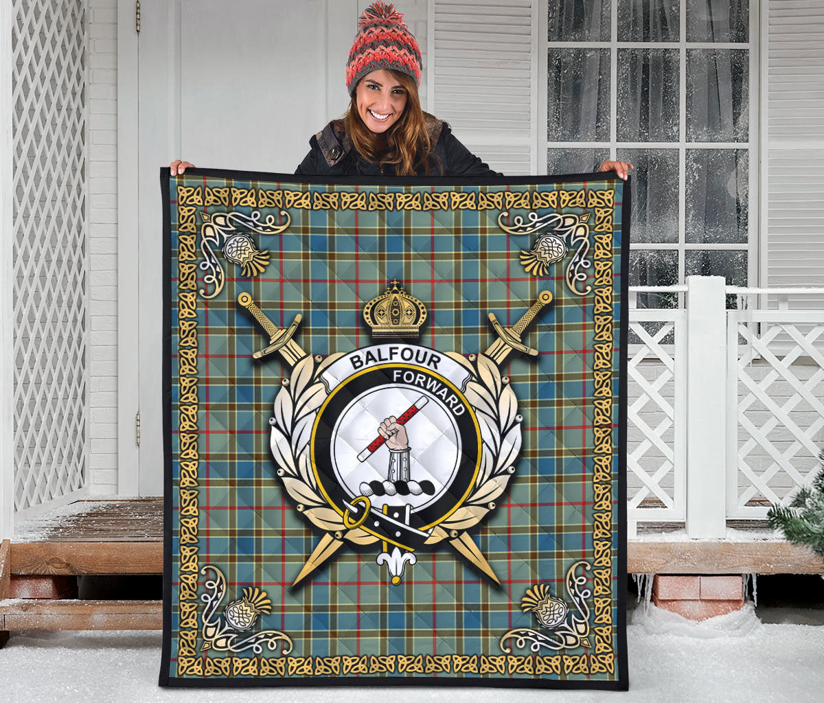 Balfour Blue Tartan Crest Premium Quilt - Celtic Thistle Style