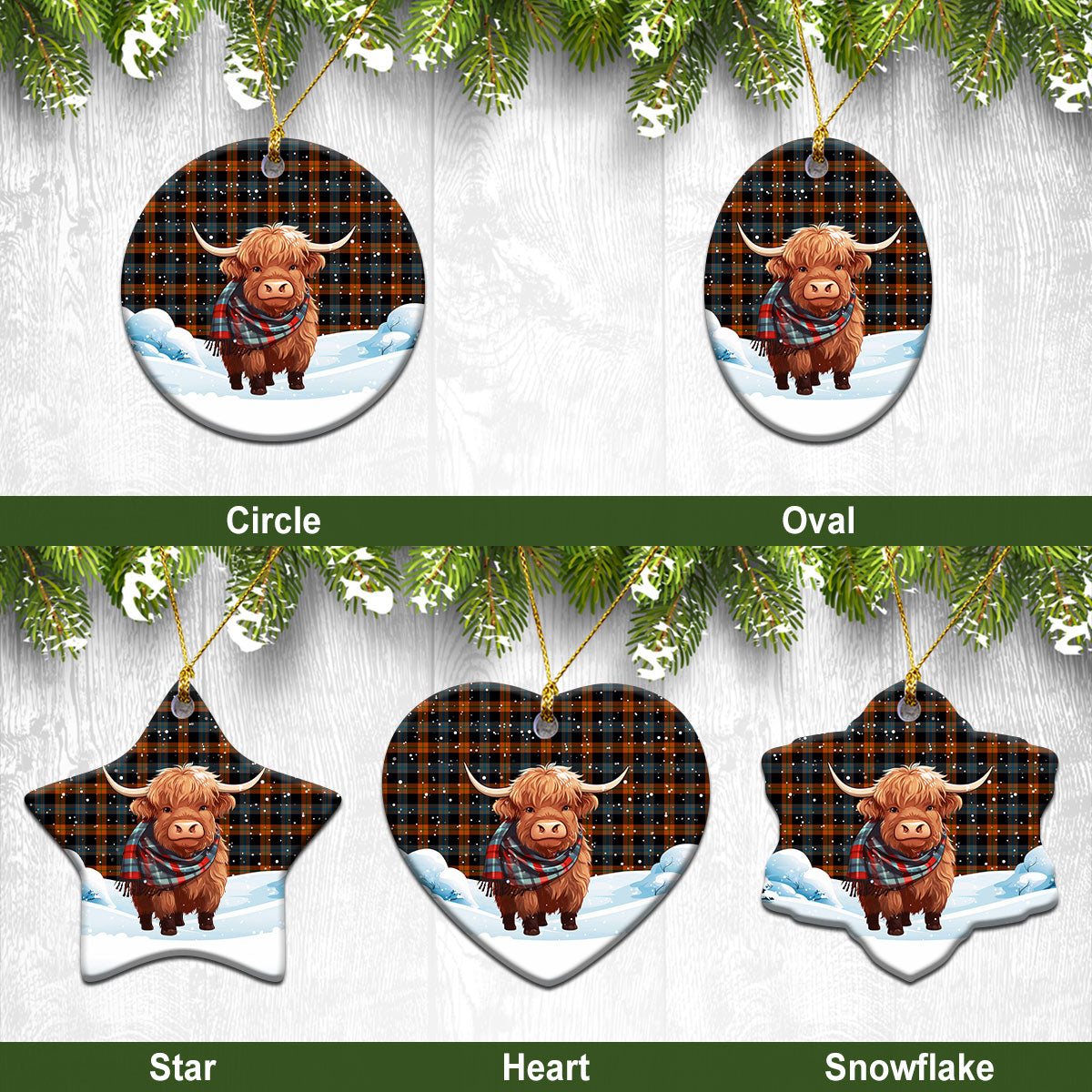 Broun Ancient Tartan Christmas Ceramic Ornament - Highland Cows Snow Style