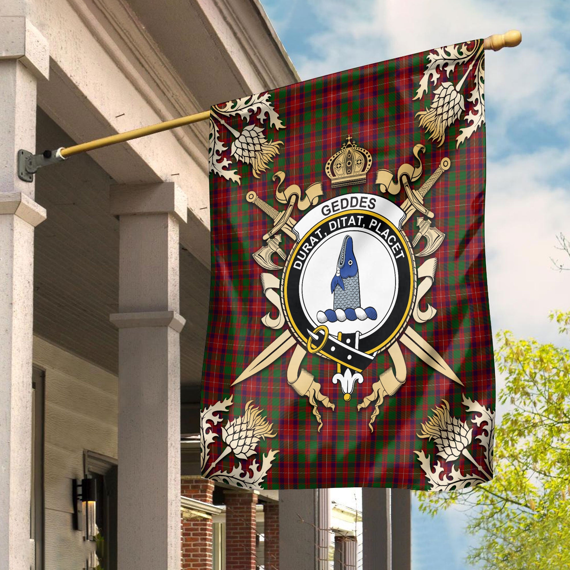 Geddes Tartan Crest Black Garden Flag - Gold Thistle Style