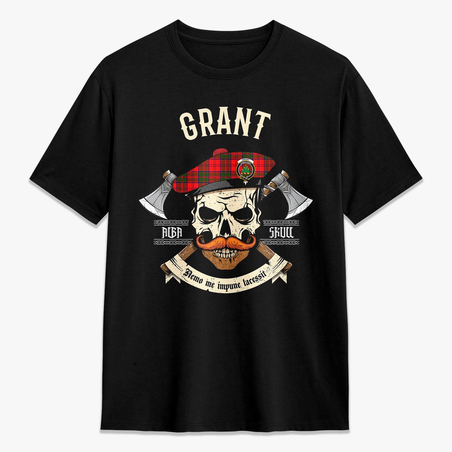 Grant Modern Tartan Crest 2D T-shirt - Alba Skull Style,