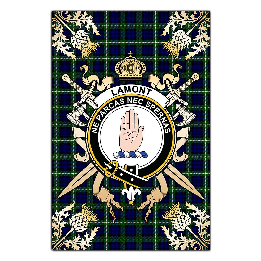 Lamont Modern Tartan Crest Black Garden Flag - Gold Thistle Style