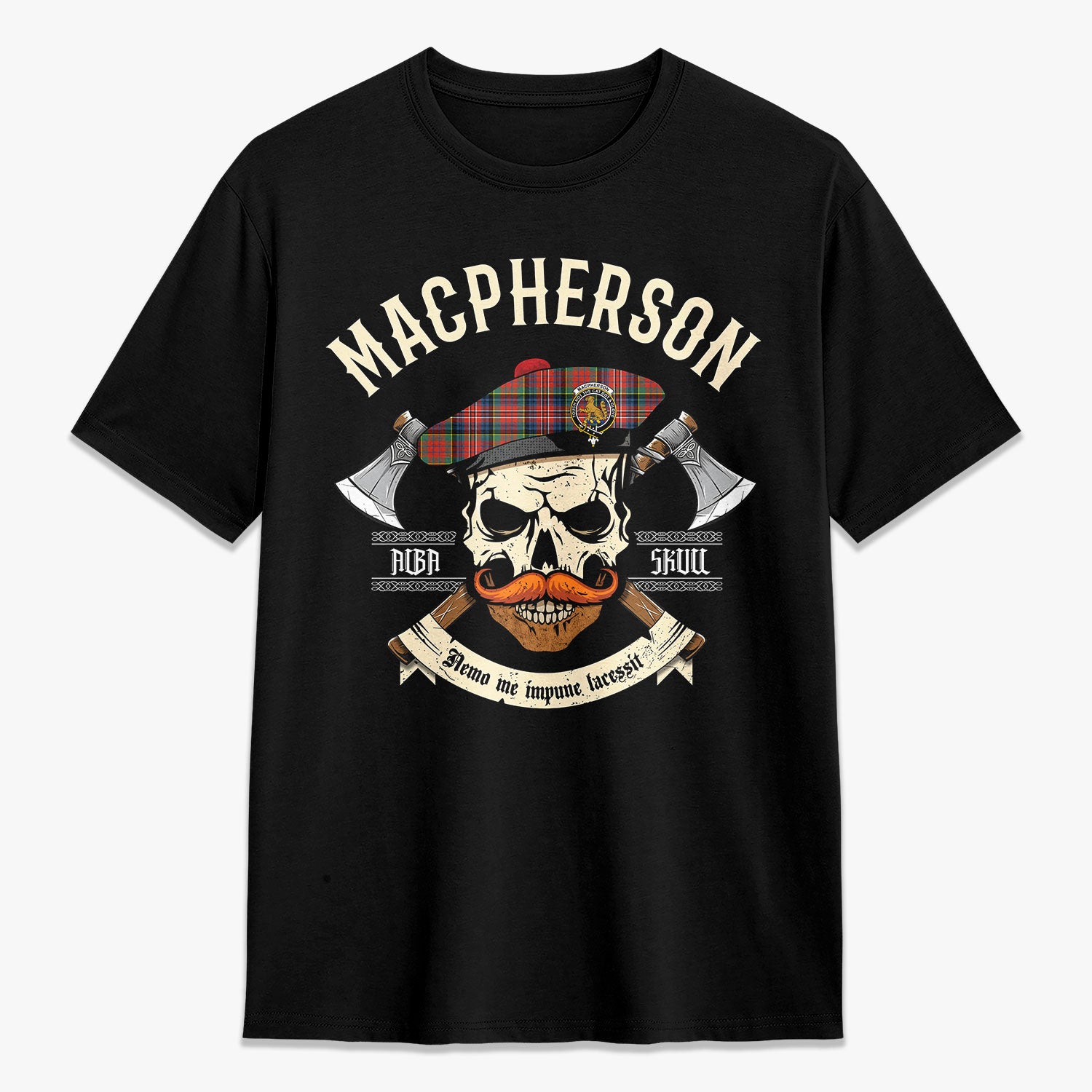 MacPherson Ancient Tartan Crest 2D T-shirt - Alba Skull Style,