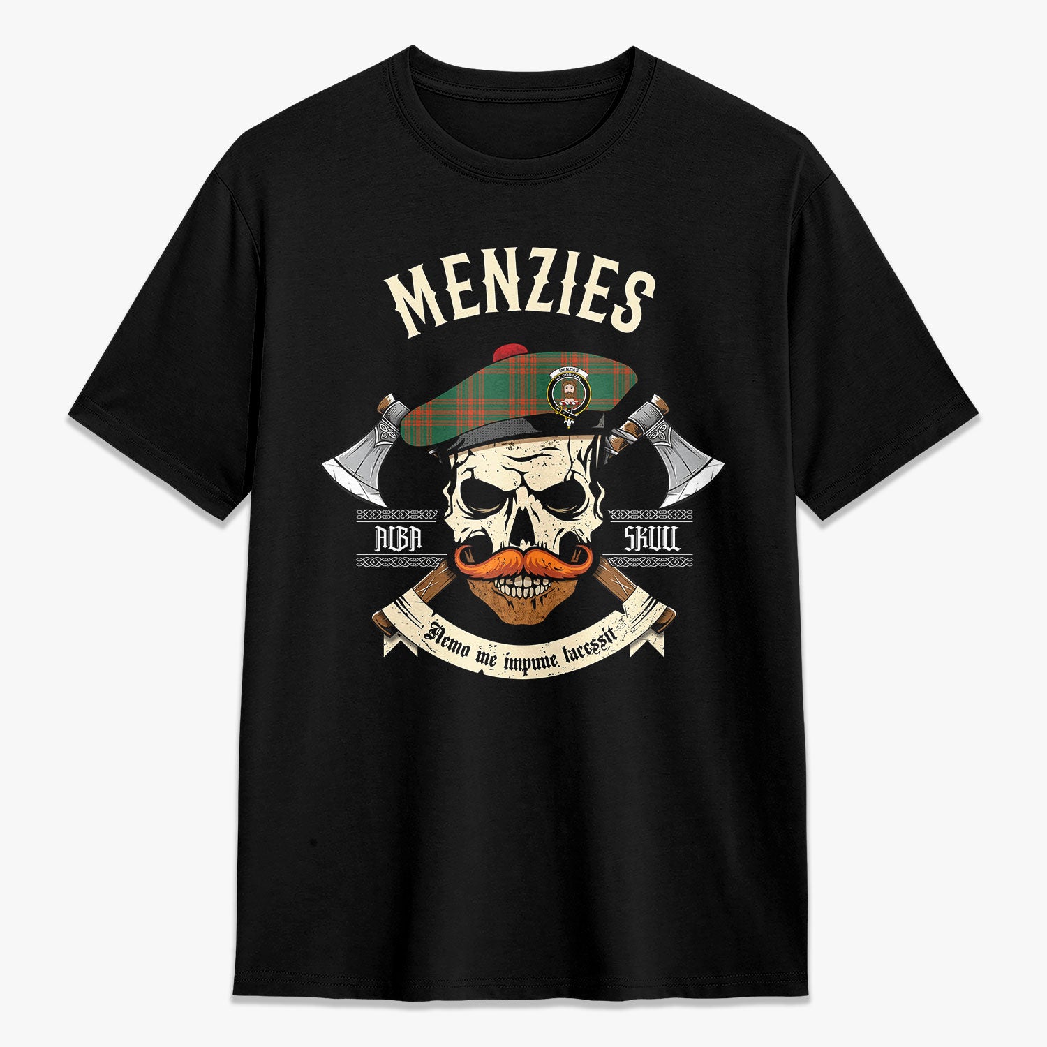 Menzies Green Ancient Tartan Crest 2D T-shirt - Alba Skull Style,