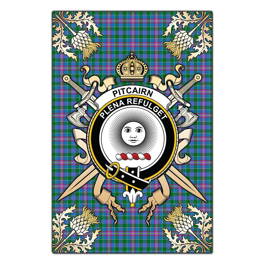 Pitcairn Hunting Tartan Crest Black Garden Flag - Gold Thistle Style
