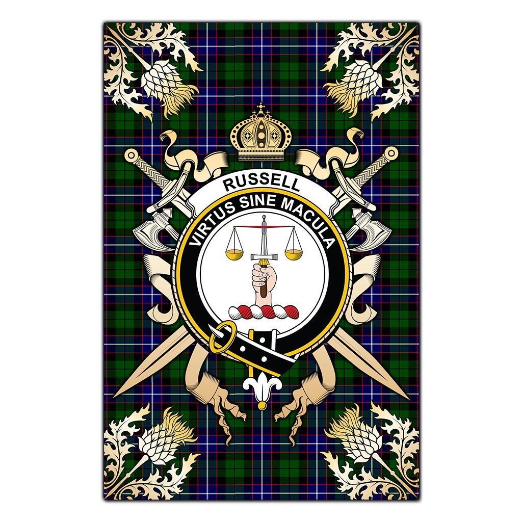 Russell Modern Tartan Crest Black Garden Flag - Gold Thistle Style