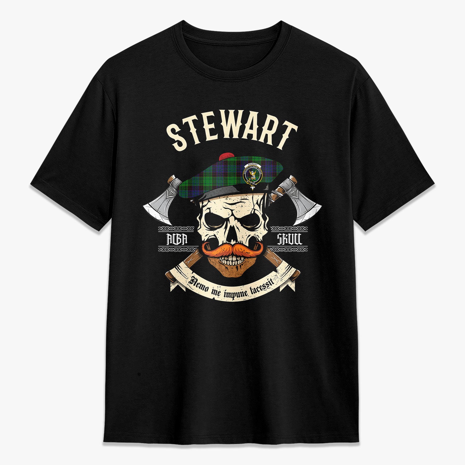 Stewart Old Modern Tartan Crest 2D T-shirt - Alba Skull Style