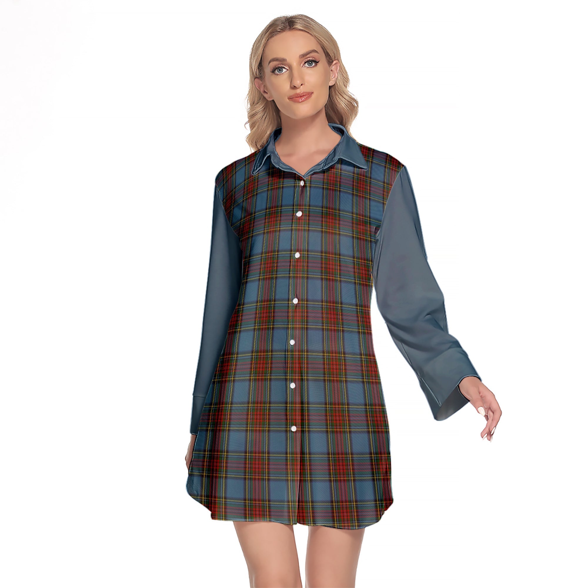 Stewart Royal Blue Tartan Women's Lapel Shirt Dress With Long Sleeve