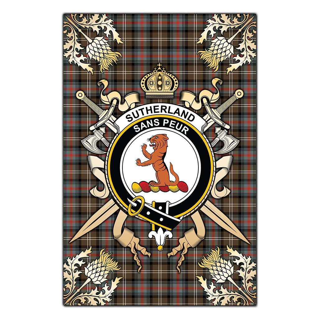 Sutherland Weathered Tartan Crest Black Garden Flag - Gold Thistle Style