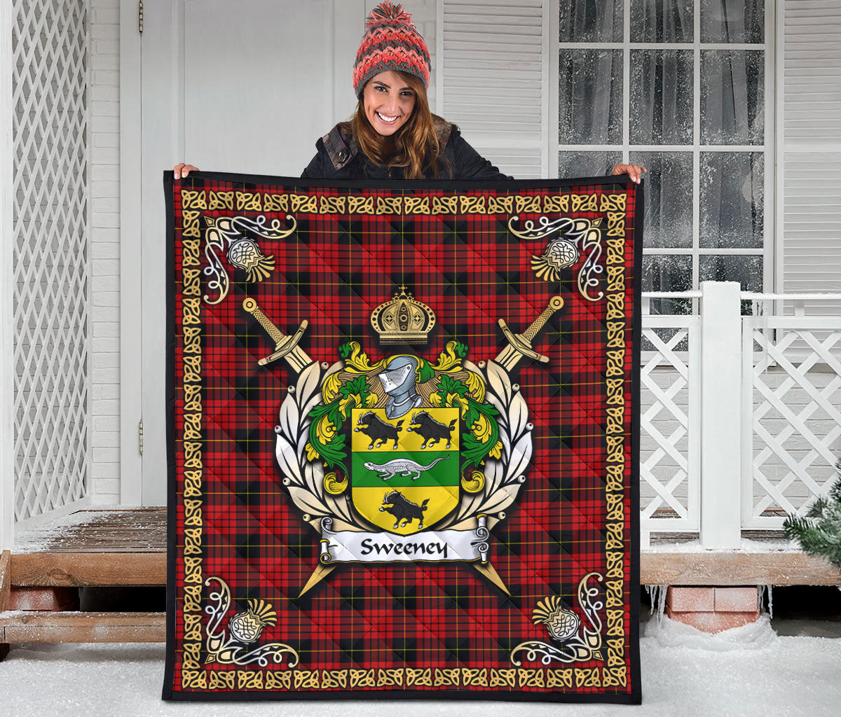 Sweeney Tartan Crest Premium Quilt - Celtic Thistle Style
