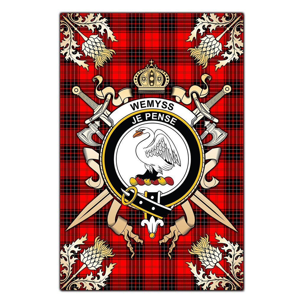 Wemyss Modern Tartan Crest Black Garden Flag - Gold Thistle Style